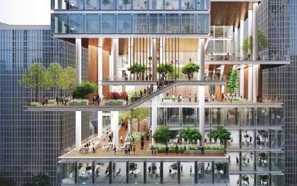 建筑組團(tuán)中央,通高兩層的“城市客廳”成為思想碰撞的熔爐;三層空中云臺通過有蓋廊道串聯(lián)樓宇,形成全天候的公共步行紐帶;而垂直分布的空中花園與地面綠脊,共同構(gòu)建出覆蓋率超30%的生態(tài)綠脈。