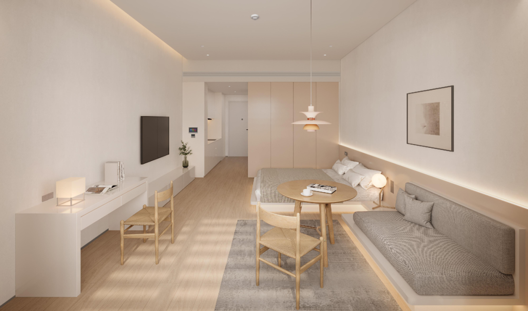 人文關(guān)懷時刻滲透生活場景。員工宿舍中,33-47平方米單間占比近90%,首層共享廚房飄散著家常煙火;專家公寓21%為一房以上戶型,引入酒店式保潔與健身服務(wù);四組分散式食堂與900平方米宴會廳通過地下廚房聯(lián)動,既能滿足日常餐飲,亦可瞬時承接千人國際會議。在這里,每一寸混凝土都承載著創(chuàng)新的重量,每一扇落地窗都映照著產(chǎn)業(yè)的未來?!@是珠光集團(tuán)對創(chuàng)新生態(tài)的溫暖承諾。